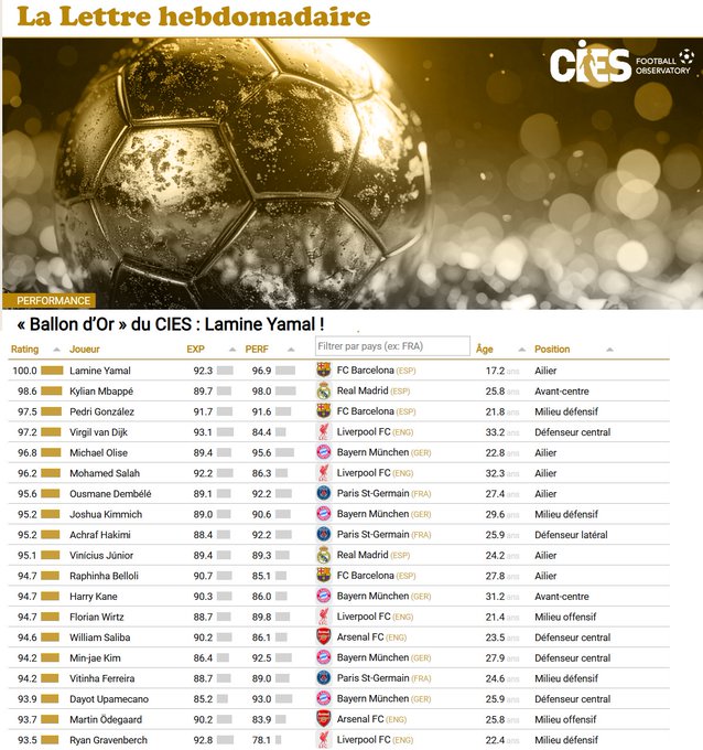 Le suspense autour du Ballon d’Or 2025 atteint son apogée. La lutte semble serrée entre Ousmane Dembélé et Lamine Yamal, mais une récente analyse statistique pourrait redistribuer les cartes. Selon l’Observatoire du football CIES, les performances des joueurs lors de la dernière année placent Lamine Yamal au sommet etune surprise inattendue pour la remise du prestigieux trophée ce lundi.