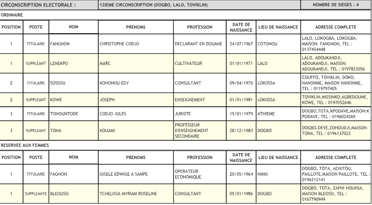 Ci-dessous, nous vous présentons les noms des hommes et des femmes désignés par le parti du cheval cabré pour représenter ses couleurs et soutenir ses ambitions lors du scrutin dans la douzième circonscription.