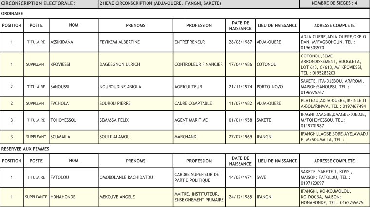 Ci-dessous, nous vous présentons les noms des hommes et des femmes désignés par le parti du cheval cabré pour représenter ses couleurs et soutenir ses ambitions lors du scrutin dans la 21e circonscription.