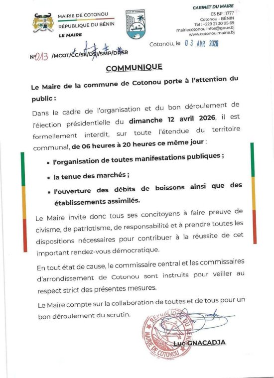 Le maire invite les populations de Cotonou à faire preuve de civisme, de patriotisme et de responsabilité afin de contribuer à la réussite de ce rendez-vous démocratique majeur.