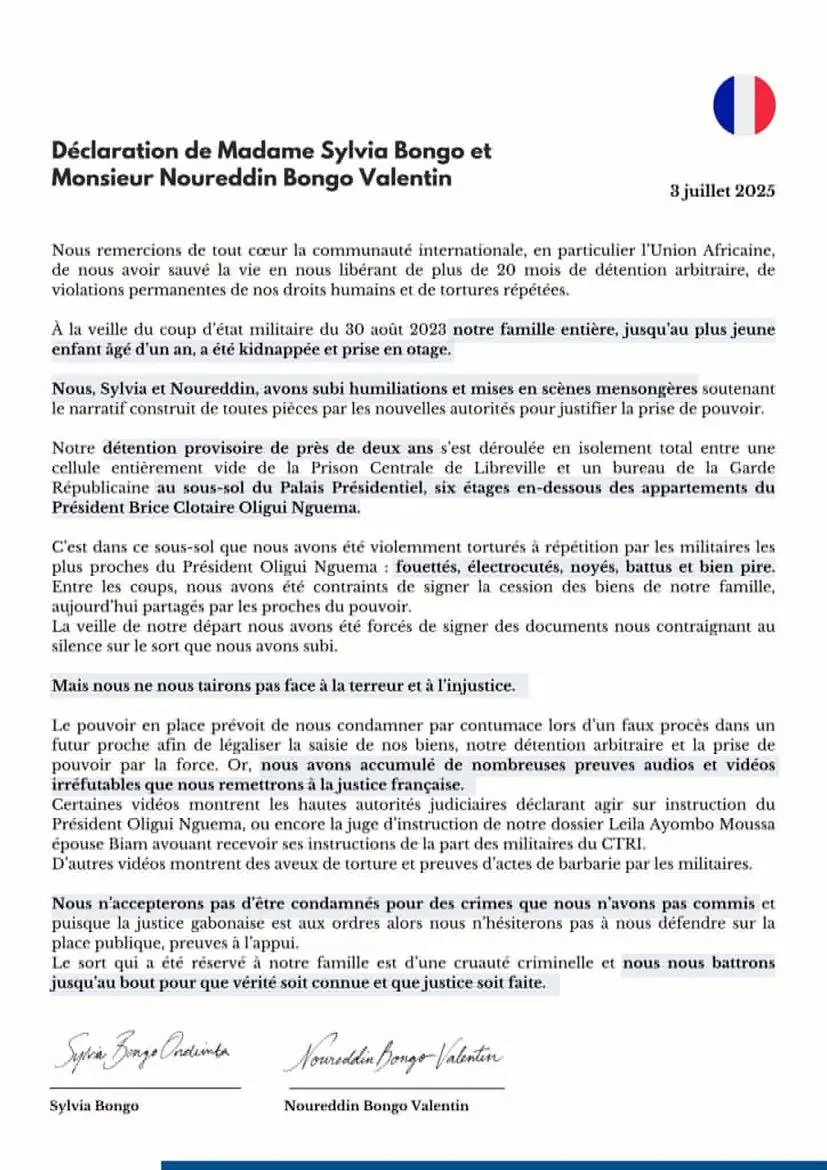 L’ex-première dame du Gabon, Sylvia Bongo Ondimba et son fils, Monsieur Noureddin Bongo Valentin, ont publié ce 3 juillet 2025, une déclaration commune à l’attention de l’opinion publique gabonaise et internationale.