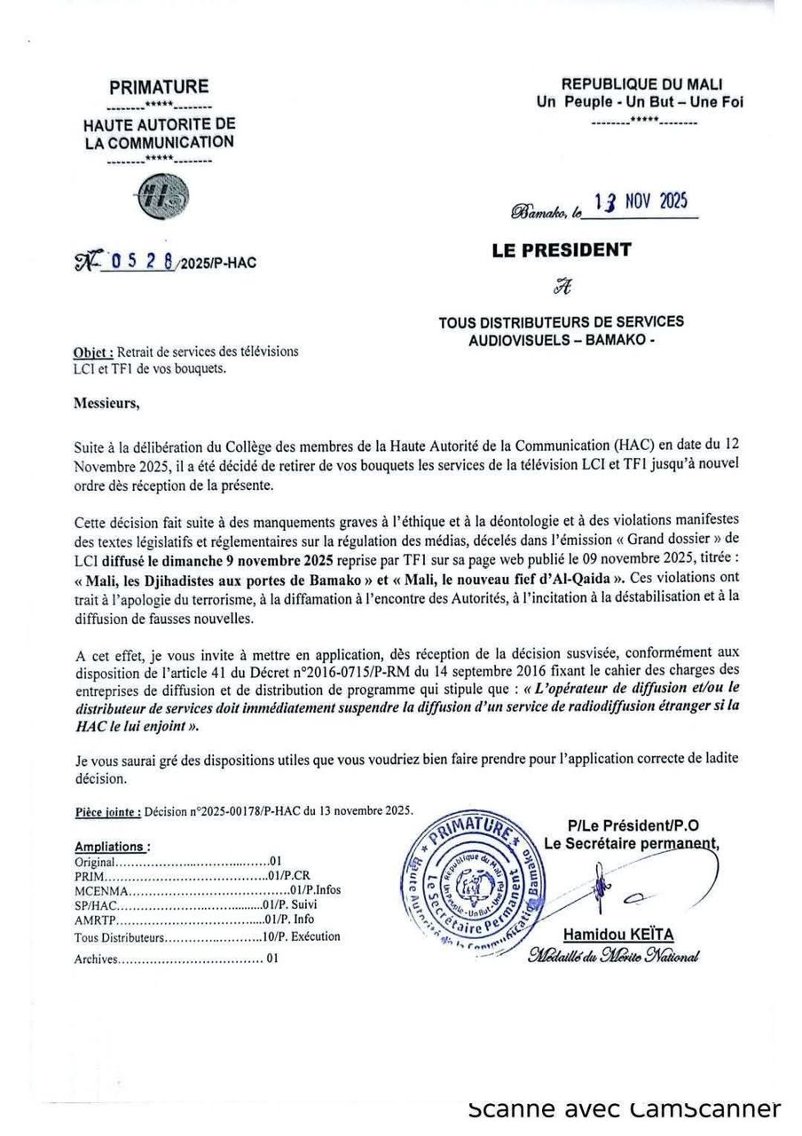 Au Mali, la Haute Autorité de la Communication (HAC) du Mali a décidé de retirer de tous les bouquets télévisés les services des chaînes françaises LCI et TF1, jusqu’à nouvel ordre. La décision a été notifiée aux distributeurs de services audiovisuels de Bamako dans un courrier officiel daté du 12 novembre 2025.