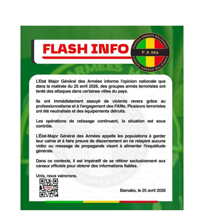 Dans un nouveau communiqué publié ce samedi 25 avril, l’armée malienne se veut rassurante. Elle déclare que les assaillants ont « essuyé de violents revers grâce au professionnalisme et à l’engagement des FAMa (Forces armées maliennes) ». Les forces loyalistes affirment avoir pris toutes les dispositions nécessaires et assurent que la « situation est sous contrôle ».