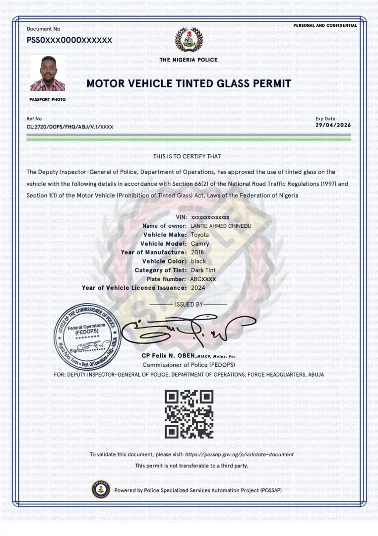 Selon la Section 3 du Motor Vehicles (Prohibition of Tinted Glass) Act, les automobilistes disposent de 14 jours après l’achat ou l’importation d’un véhicule pour remplacer les vitres teintées) y compris les modèles avec vitres d’origine foncées (sauf s’ils disposent d’un permis officiel. Ce permis peut être obtenu en ligne via la plateforme possap.gov.ng.