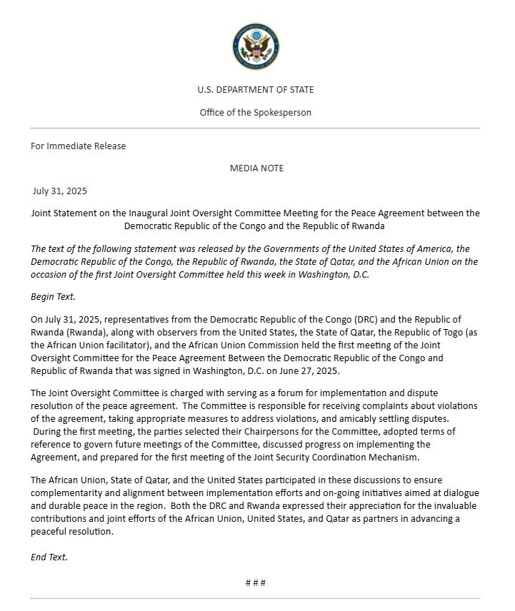 Les gouvernements des États-Unis, de la République démocratique du Congo (RDC), du Rwanda, du Qatar, du Togo ainsi que l’Union africaine ont publié une déclaration conjointe à l’issue de la toute première réunion du Comité mixte de suivi de l’accord de paix signé entre la RDC et le Rwanda le 27 juin 2025 à Washington.