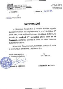 Au Bénin, le ministre du Travail et de la Fonction Publique, Adidjatou Mathys a, à travers un communiqué publié ce lundi 28 octobre 2024, annoncé que le vendredi 1er novembre 2024, est déclarée fériée, chômée et payée.